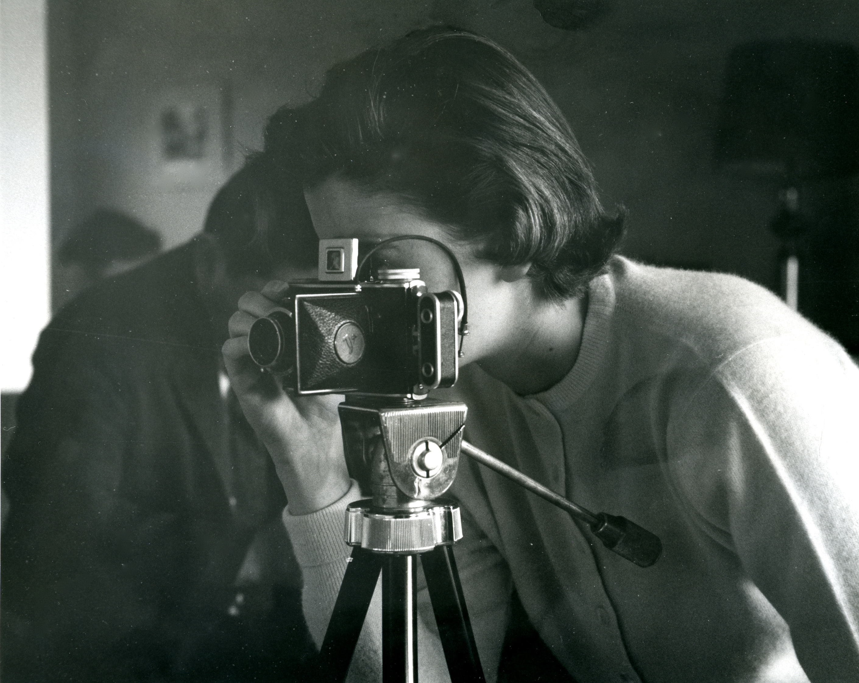 Suzanne Vanderbilt behind the camera. Vanderbilt was a prolific photographer, and her many photographic slides are held in the archives. Suzanne Vanderbilt Papers, Cranbrook Archives.