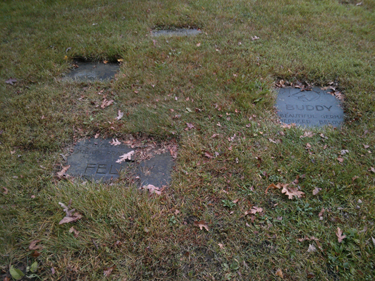 Taking a stroll one day on the grounds of the Thornlea Studio (where Cranbrook Archives was previously housed) I was startled to come across small tombstones, almost buried in the grass. What were these, I wondered? Seeing the names, I immediately understood: Buddy, Homer, Perky, Heinie, Fellow, Ricky, Zorah—a pet cemetery, which had seen better days.