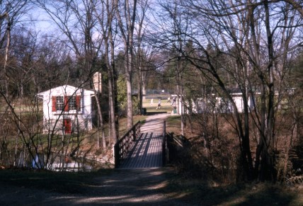 View of the Senior Cabin (left) with the Western Playfield Shelter, 1963. Courtesy Cranbrook Archives