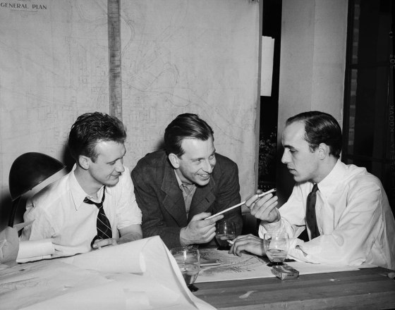 Rapson (left), with Eero Saarinen and Fred James working on a competition drawing for the Festival Theatre at the College of William and Mary, 1939.