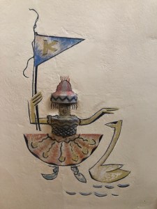 A colleague recently inquired about a painting on the mezzanine wall leading to the music practice rooms at Kingswood School. The painting is of a girl, “Kitty Kingswood,” who is holding a pennant and is accompanied by a swan on the waves of Kingswood Lake. Eliel Saarinen painted the image in the 1930s to camouflage clay sewer pipes.