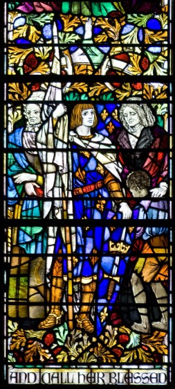 Panel 14, Liberators: Lucretia Coffin Mott (American, 1793-1880), active against slavery and for women’s rights; Jeanne d’Arc (French, 1412-31), mystic, military leader and martyr; Harriet Beecher Stowe (American, 1811-96), with slave boy, who greatly influenced the emancipation of African Americans through “Uncle Tom’s Cabin”. Tom Booth, photographer. Copyright Christ Church Cranbrook 2010.