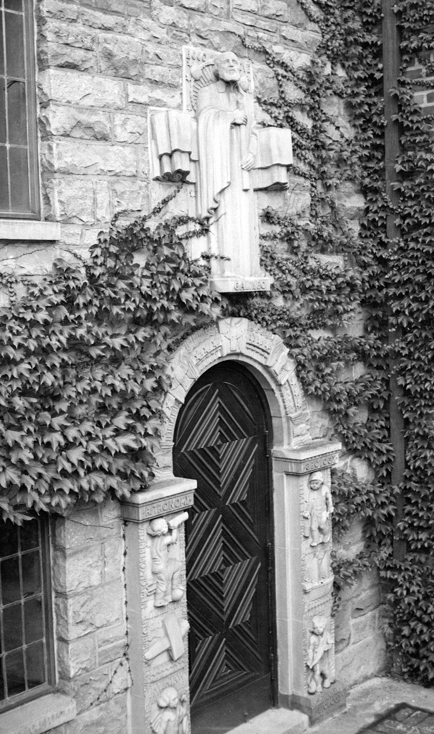 “Door of Knowledge” by Géza Maróti at entrance of Cranbrook School for Boys Library. c. 1985. Richard Hirneisen, photographer. Copyright Richard Hirneisen/Cranbrook Archives.