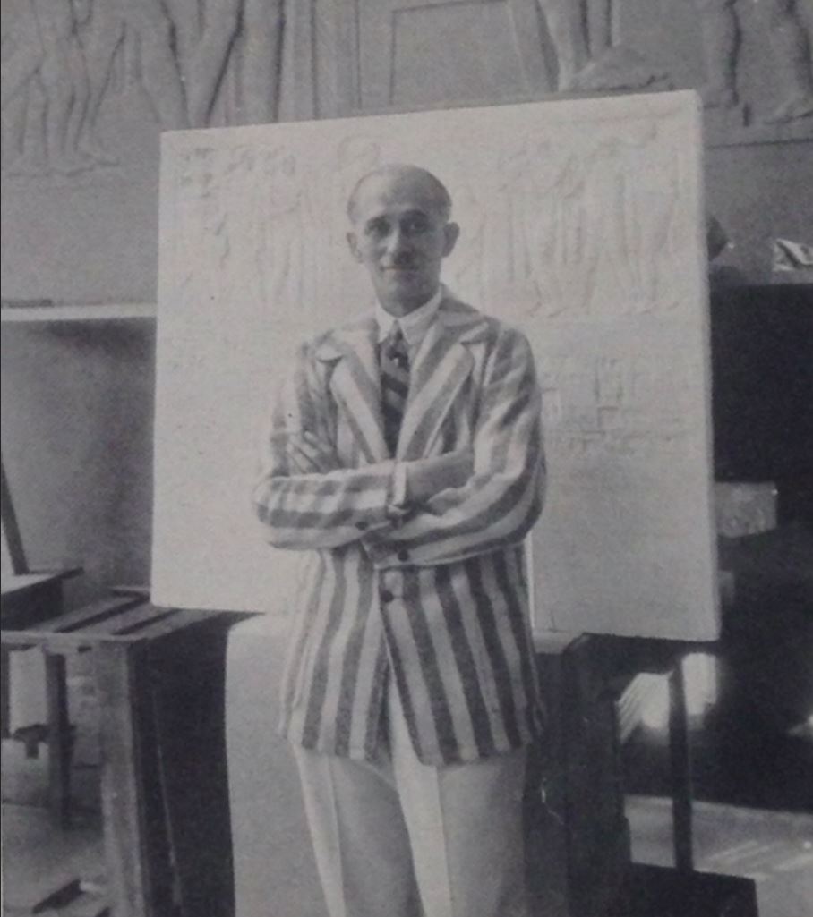 Maróti with his design for the Cranbrook School for Boys library overmantel behind him in his studio, 1927. Courtesy Cranbrook Archives.