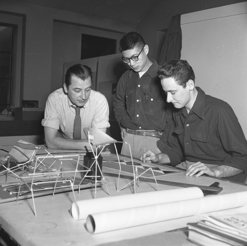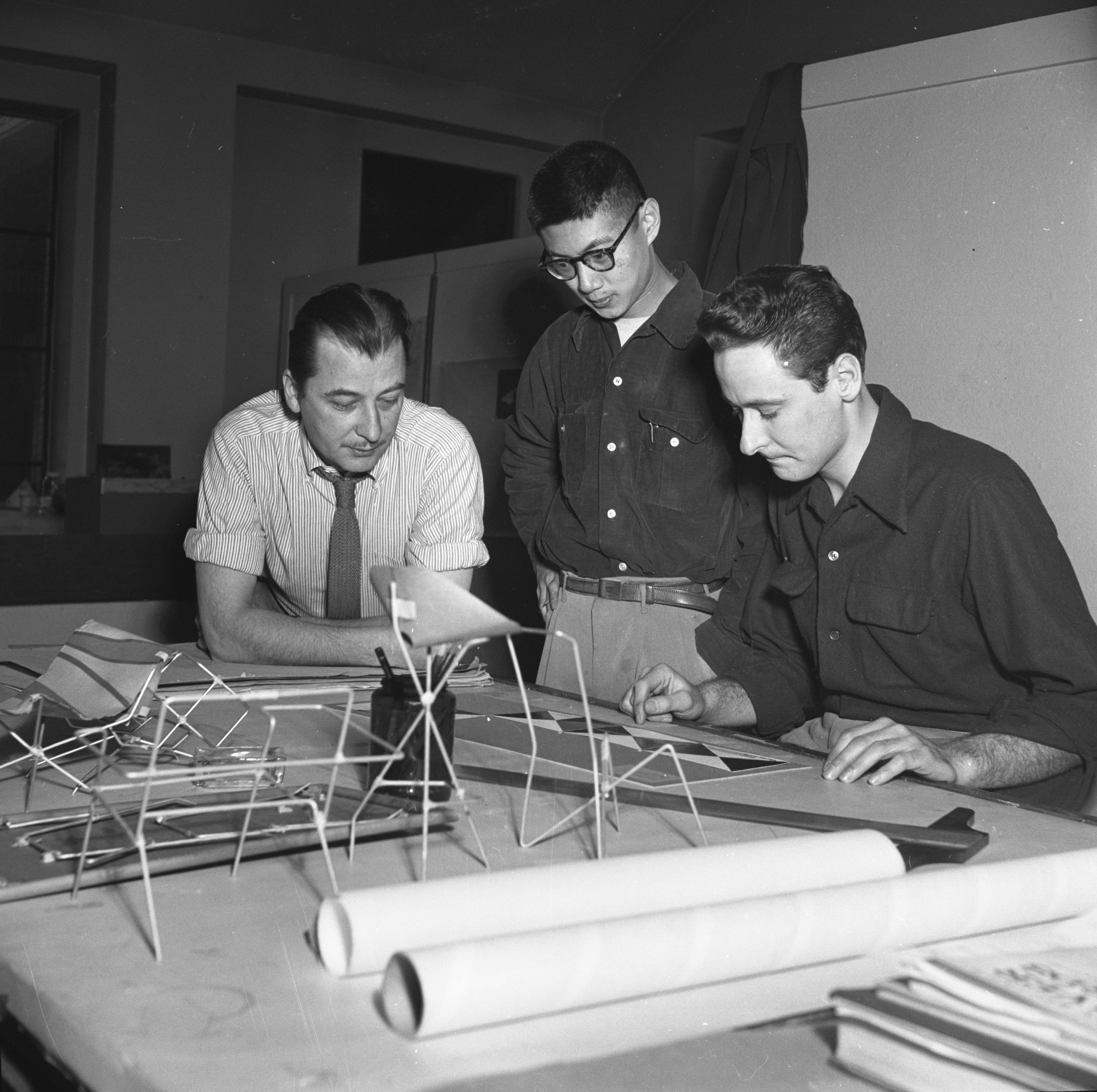 Ted Luderowski, left, with students in the design studio, February 1952. Cranbrook Archives.