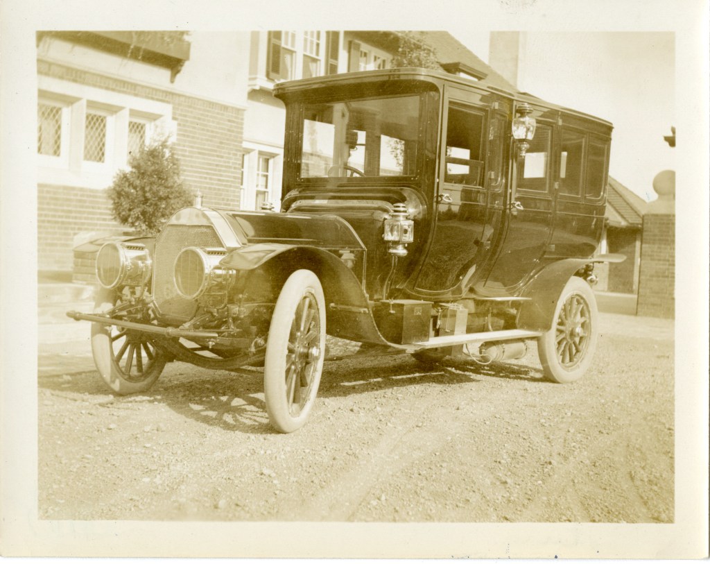 The Pierce-Arrow with its winter body in front of Cranbrook House, 1908. James Scripps Booth photographer, Copyright Cranbrook Archives.
