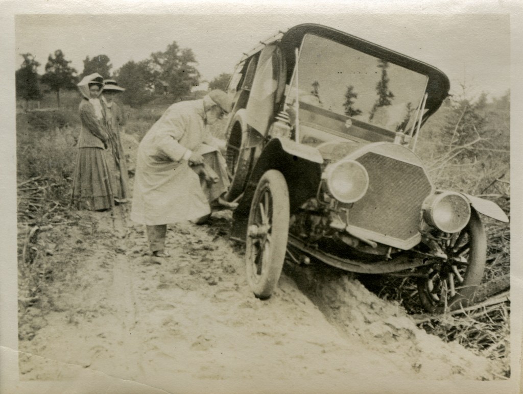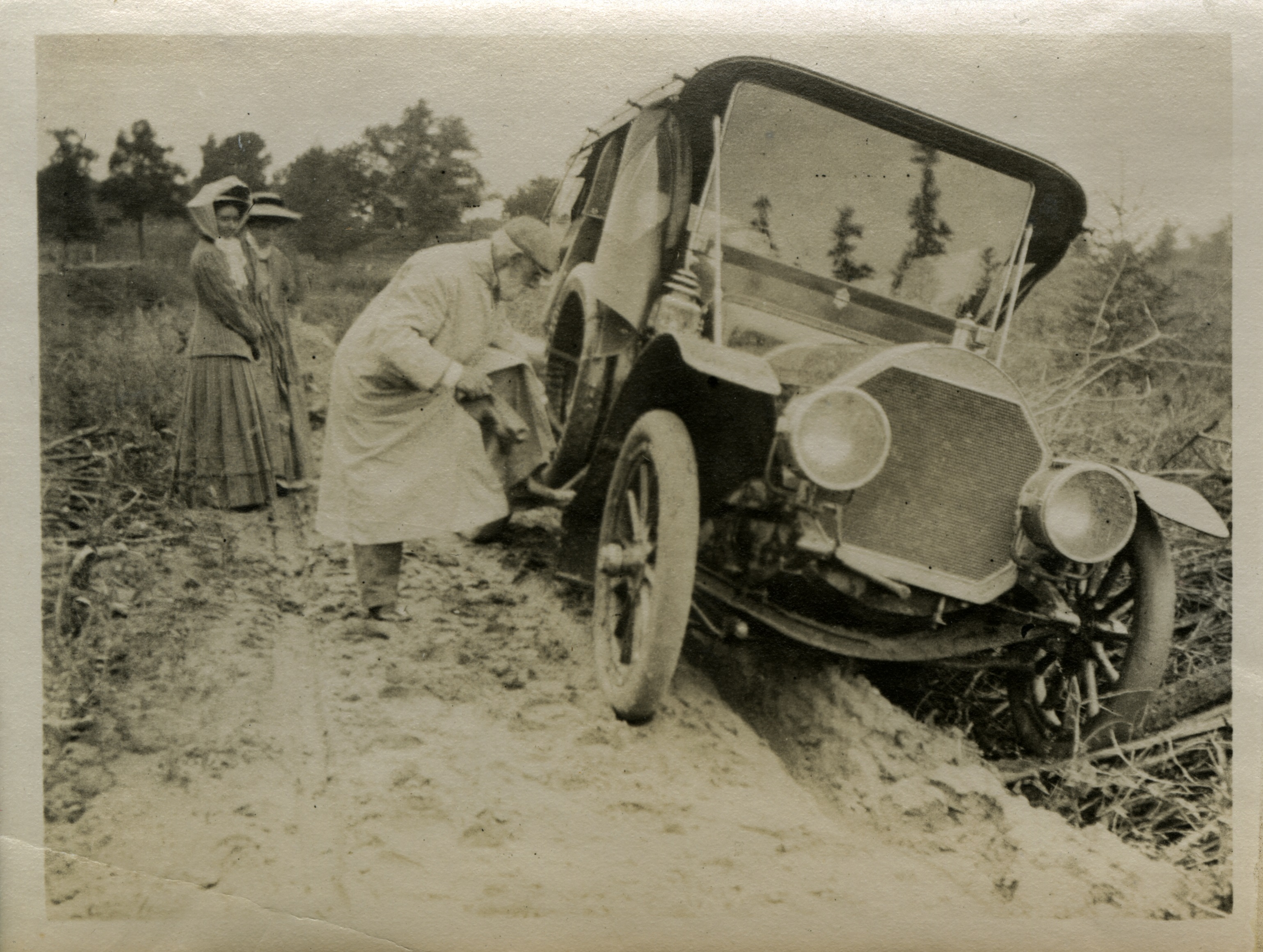 Ellen Scripps Booth, Jean McLaughlin Booth and Henry Scripps Booth on Lahser Road with the 1908 Pierce-Arrow in the ditch, 1911. Courtesy Cranbrook Archives.