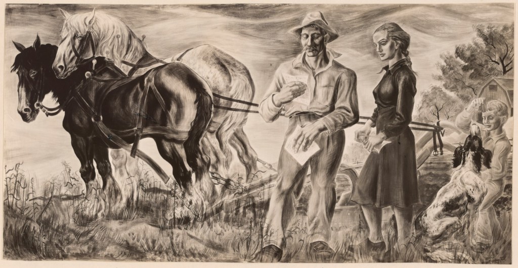 Of course, each artist also wanted to leave their mark on the project. It wasn’t just about the money—for most murals, the artist received a whopping $700 for what often took the better part of a year to create. What’s interesting about Fredenthal’s mural is not simply the young couple on the farm, reading a recently delivered letter (from the USPS, not UPS or Amazon Prime…), but the horses off to the side. They seem a little frisky to my eye, engaging in their own intimate relationship.
