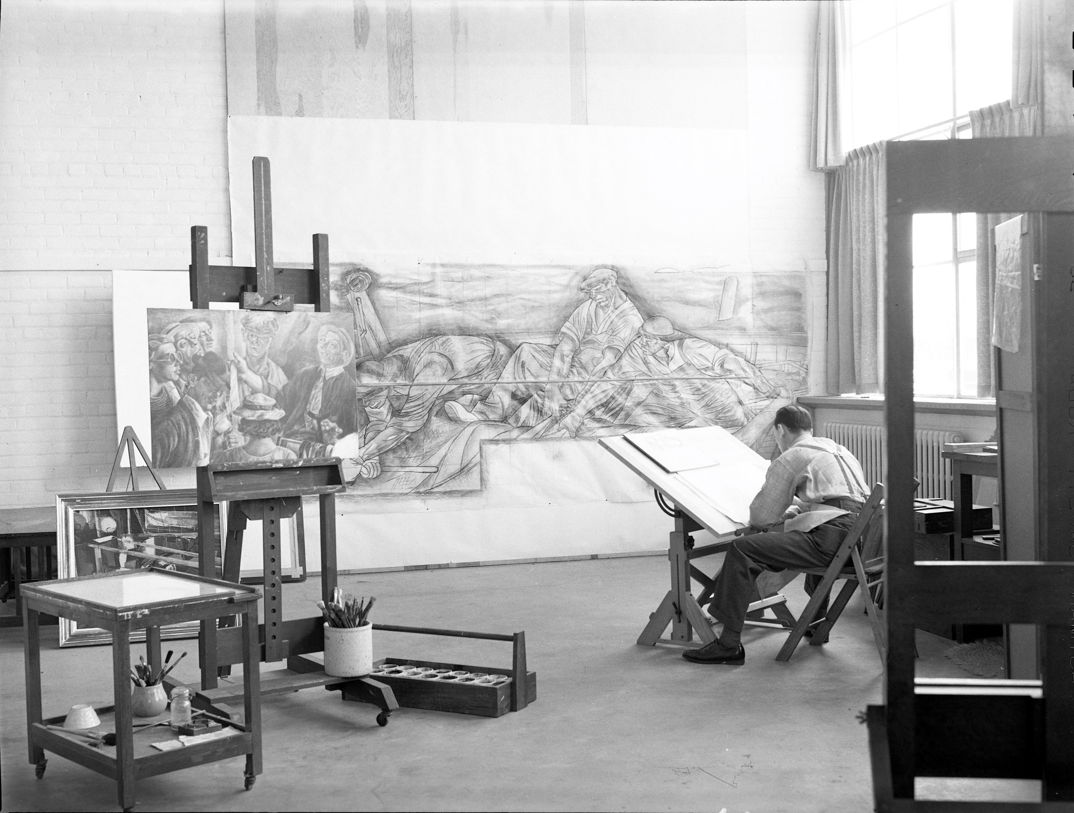 Separate and distinct from the more extensive and influential WPA or Works Progress Administration’s “Federal Arts Project,” which essentially was a work-relief program for artists, the purpose of the Treasury Department’s “Section” program, as it came to be known, was “to secure for the Government the best art which this country is capable of producing, with merit as the only test.” Sepeshy and Fredenthal, with their recently minted Cranbrook credentials, fit the bill. Fredenthal even had some mural experience, having recently painted an octopus mural for the Academy’s now infamous Crandemonium Ball in 1936.