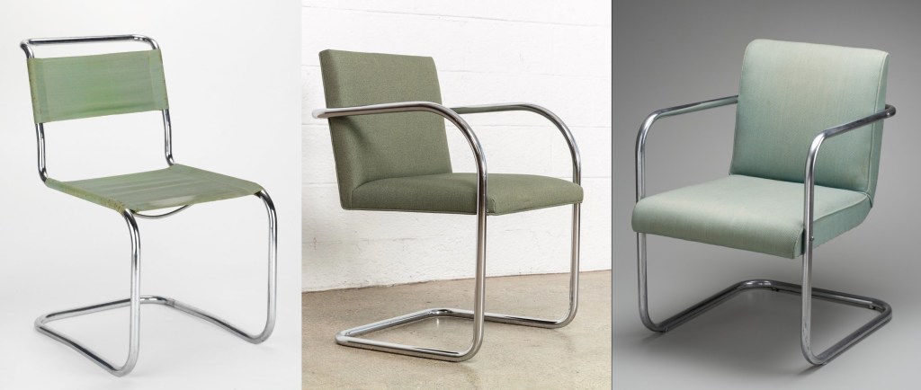 Second, a chair that eschews historic forms for the avant-garde: the chrome plated, tubular steel Kingswood Auditorium armchair. Eero Saarinen’s cantilevered design recalls the furniture coming out of Germany in the 1920s, particularly the work of Marcel Breuer at the Bauhaus. Breuer was a twenty-three-year-old student at the revolutionary German design school when, inspired by bicycle handlebars, he ordered tubular steel from the bicycle manufacturer Adler and built the world’s first tubular steel chair in 1925. Architect and president of the Bauhaus Walter Gropius was so taken with the initial tubular steel chair he invited Breuer to design most of the furnishings for the school’s new modern buildings in Dessau.