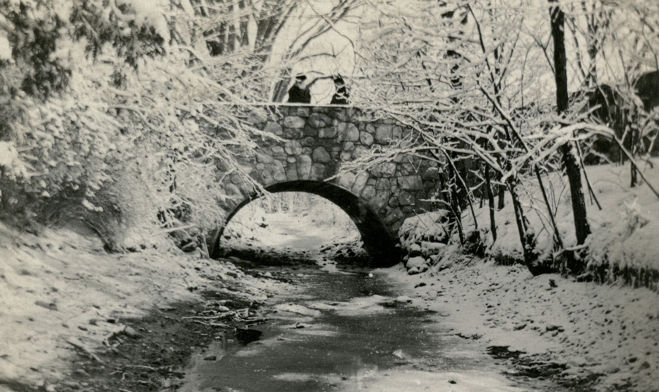 Henry Wood Booth and Alice Booth Miller on the arched bridge over the Mill Race, March 1916.