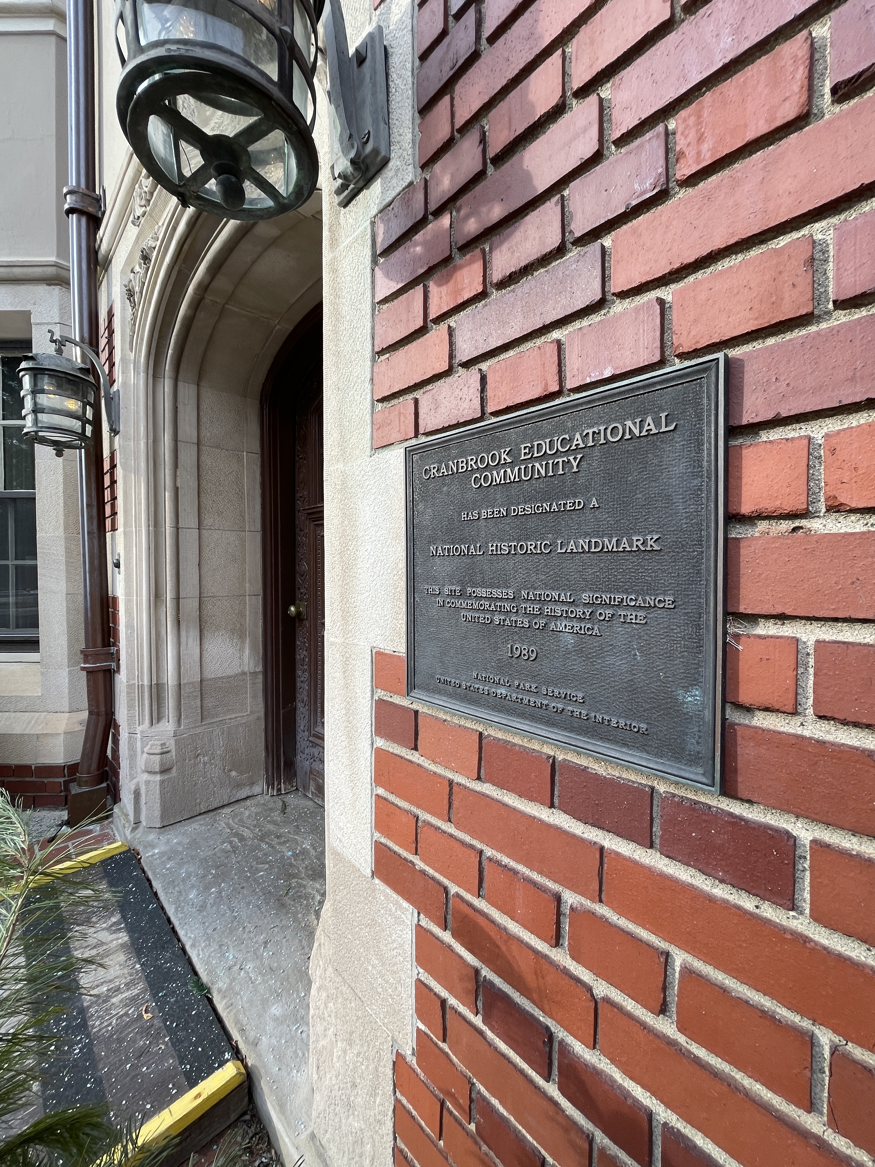 National Historic Landmark plaque for the entire Cranbrook Educational Community next to the front door of Cranbrook House.