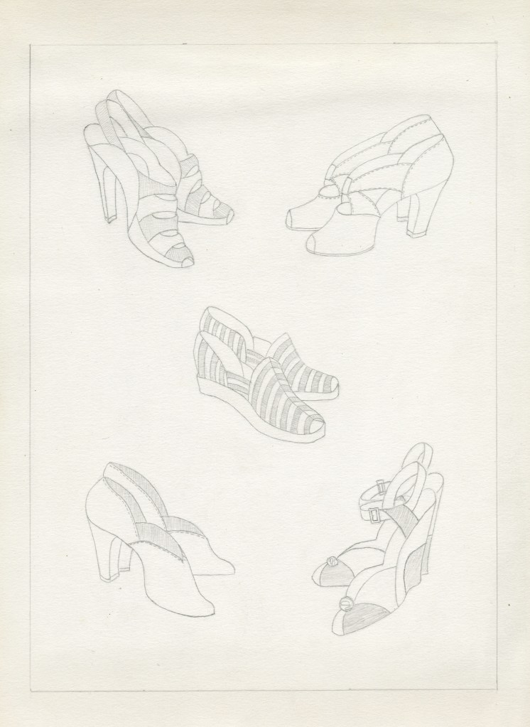 A third notebook, unidentified and wrapped in plain brown paper, contains more fashion illustrations and fabric studies, but also includes figure and anatomy studies. Quite possibly the result of Ruth’s Beaux Arts coursework at Wayne State University (simultaneous with her high school studies), this book of illustrations contains solely pencil drawings.