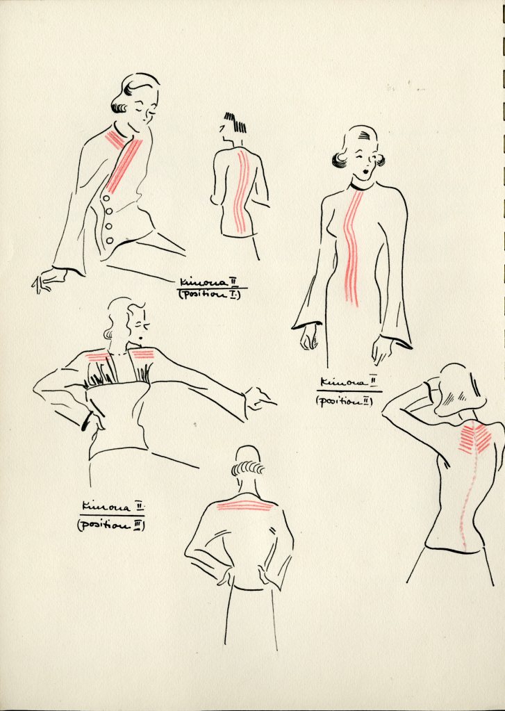 Amongst other documents in her collection, the story of Ruth’s high school years and her passion for fashion are perhaps best captured in three notebooks. One of my favorite boxes in the collection holds nothing but pages from a notebook entitled Dress Design VI. Labeled “hours 1-4″ it is clearly a class project, and one for which Ruth received high marks. Divided into four parts (Machine Attachments, Illustrative Material, Drafting Problems, and Analysis of Dresses), the book includes drawings, pattern pieces (not to scale), paper mockups of mainly women’s sportswear designs, samples of sewing technique (actual fabric pinned to the page), textile identification pages (with real fabric samples), and an essay on silk.