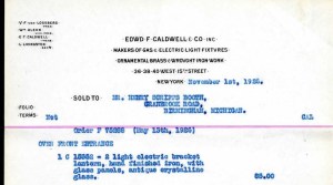Cooper-Hewitt to the rescue! Many of the Edward F. Caldwell & Co. catalogs have been digitized and are available at the Cooper-Hewitt Museum Library, Smithsonian Institution Libraries. A quick search gave me the result I was looking for. Caldwell item A 15352 matches the fixture on the front of Thornlea, and the receipt in Archives. We now know the maker, the materials, and when the item was installed.