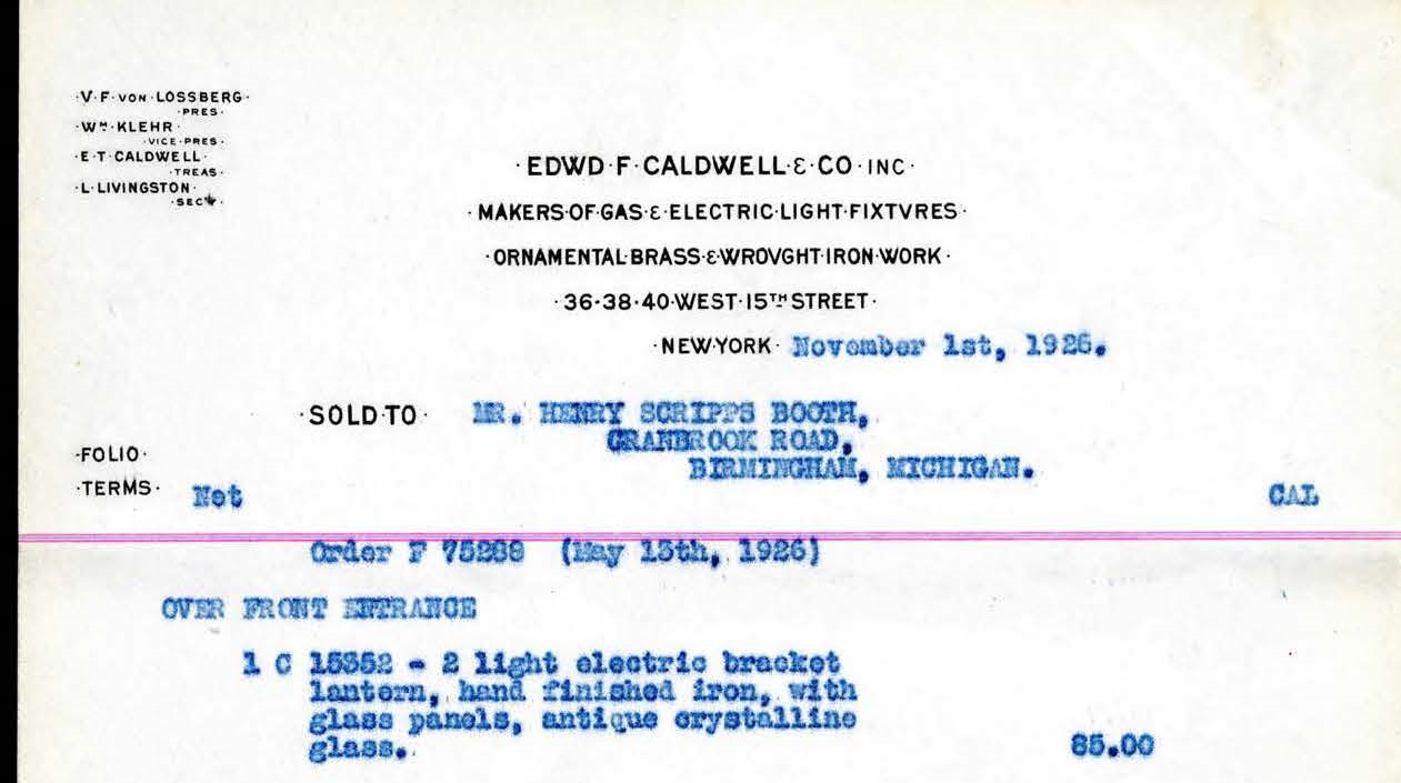 The fixture was created by Edward F. Caldwell & Company, a favorite of George Booth while he was building Cranbrook House. The receipt has a number (A 15352) and says it was installed over the front door. How could I confirm it was the same fixture?