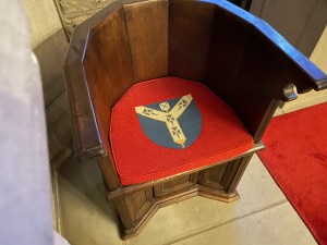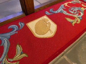 There are two priest’s kneelers with no symbols and two priest’s chair cushions, one with the seal of Christ Church Cranbrook and one with the seal of Canterbury Cathedral, where St. Dunstan last served as Archbishop.