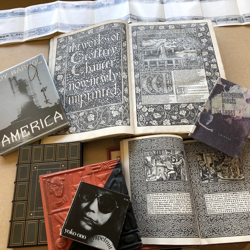 The Academy Library’s Rare Book Collection also originated with transfers from George Booth’s library, and continues to grow with new acquisitions. Currently, it contains 775 volumes. Criteria for inclusion considers age, special bindings, historical significance to Cranbrook, or monetary value. The collection also includes signed copies and artists’ books.