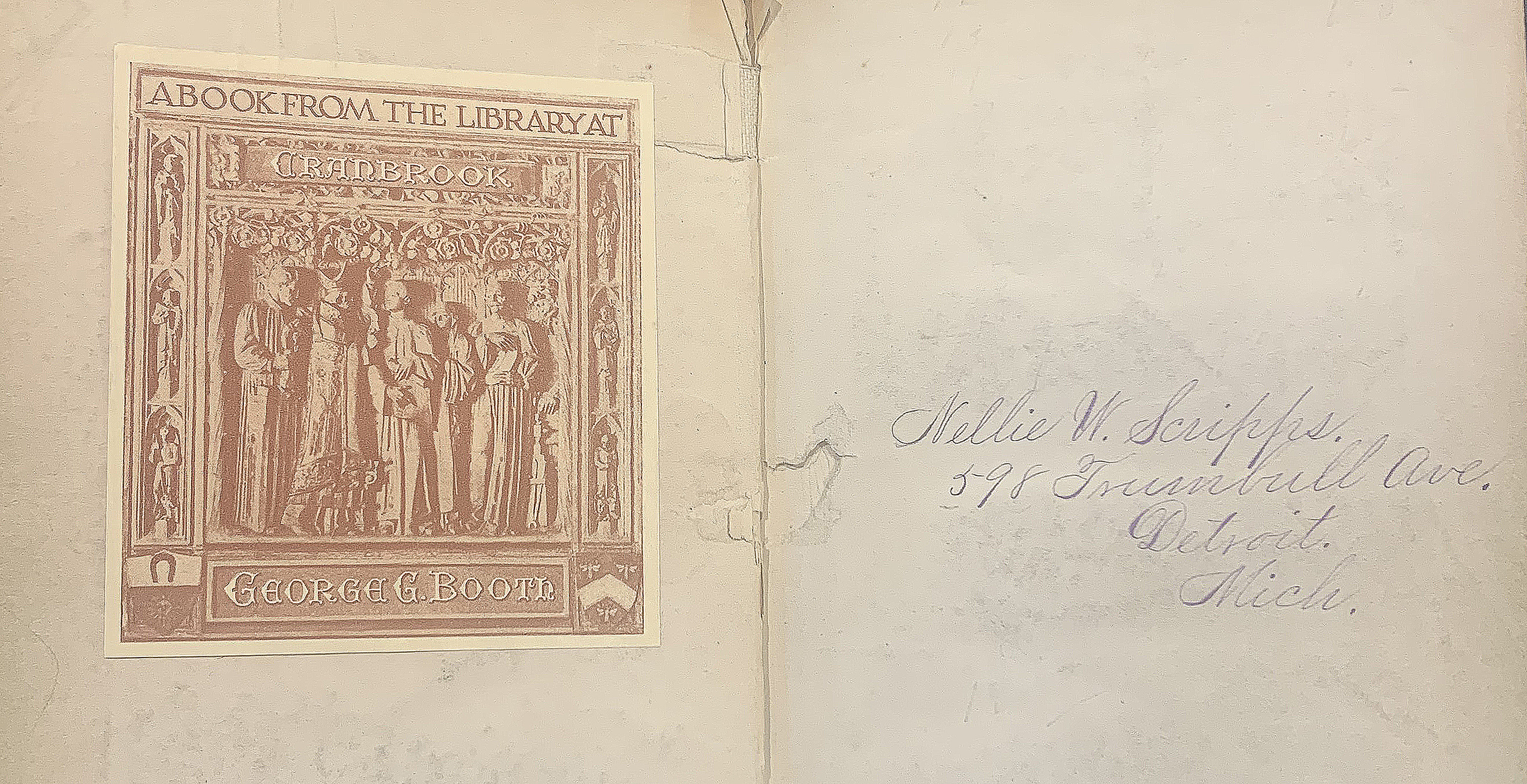 Of those originating with the Cranbrook House Library are included early works written or illustrated by Booth family members or Cranbrook students and staff, such as Brookside School’s The Stream and The Detroit News, 1873-1917, illustrated by George’s son, James Scripps Booth. There are also volumes with personal inscriptions to and from Booth Family members, providing an idea of both their interests and affiliations, as well as their penmanship skills.