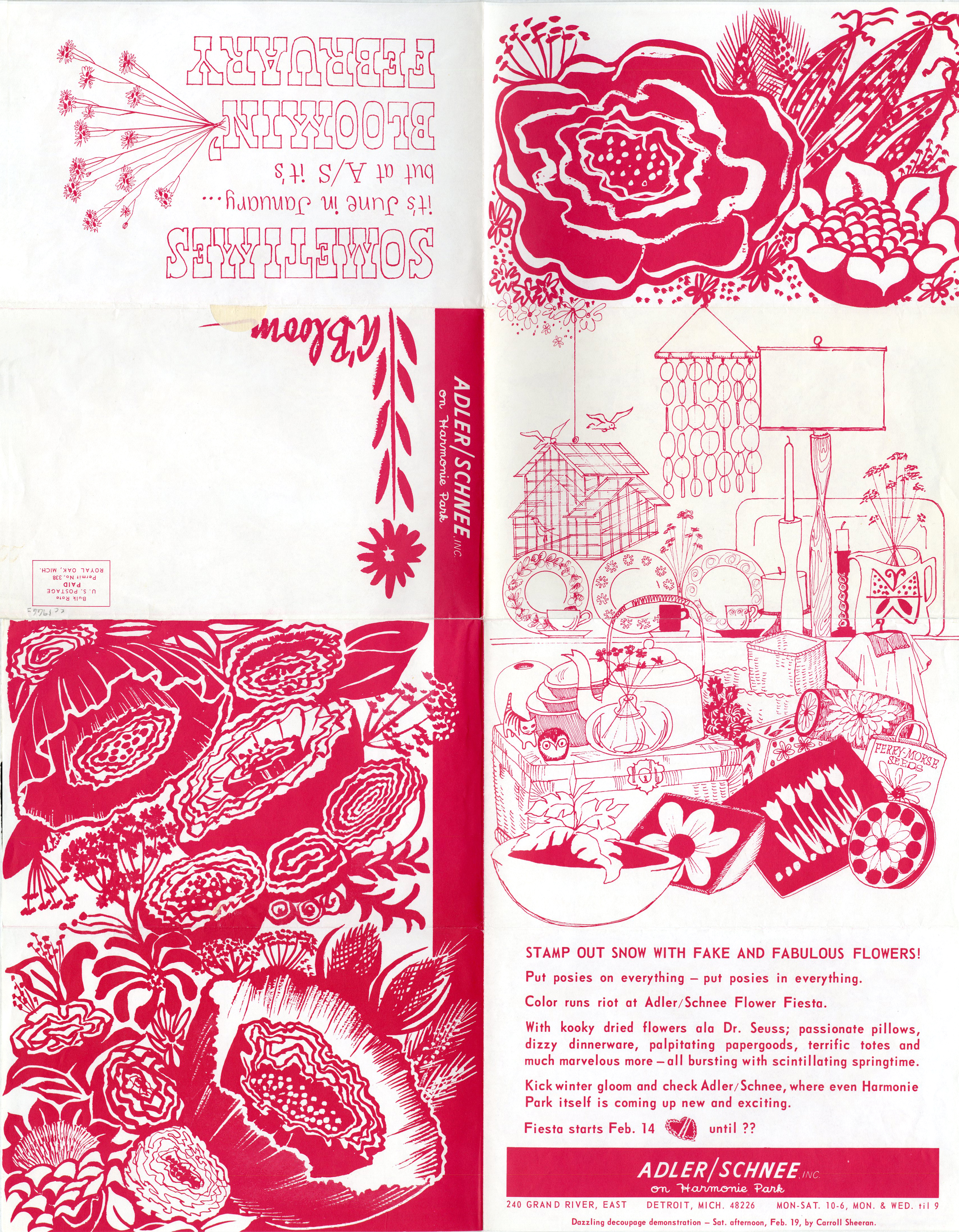 The Flower Fiesta was just one in a series of events Adler/Schnee hosted in their Harmonie Park store between 1964 and 1977. In a previous blog, Deborah Rice wrote in more detail about the Adler/Schnee store, and the couple’s commitment to Detroit.