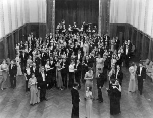 For the men at the dance, there is a curious mélange of a wing tip collar with a black or white bowtie—a throwback to the white tie and tails of Fred Astaire movies. Look in the back to the older members of the orchestra where they have a soft collar and a black bowtie, which if not the norm then, will certainly get there.