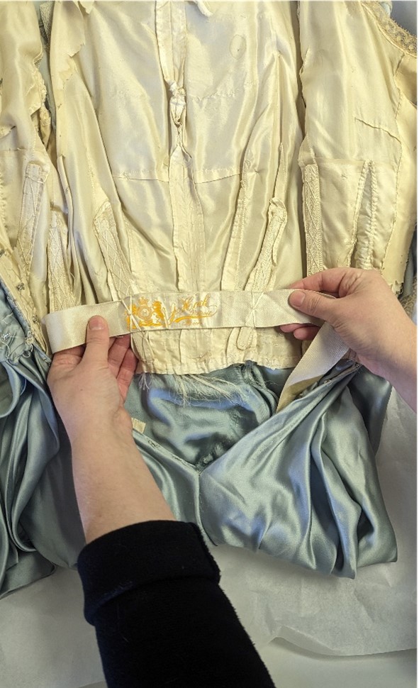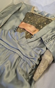Two dresses from the period caught my eye. The first is a soft silk gown with the characteristic empire waist and deep-V neckline of the mid-1910s with inset gold metallic lace, pink ribbon and white lace sleeves. This icy blue fabric was a popular color in the early twentieth century and was known as “Alice Blue,” named for the headstrong daughter of President Theodore Roosevelt (and popularized through the jazz and Broadway standard later performed by Judy Garland and Liza Minelli). The waistband reveals that the dress was made by Jacob Hock, Detroit’s “Leading Ladies’ Tailor,” likely at his premises on Brush and Adams Street.