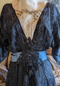 A second evening gown from the collection also has a floral lace inset and a low V-neckline, which has been backed with an opaque modesty panel at some point in the garment’s history. The dusty blue of this dress is overlaid with several layers of black tulle and lace and the waist is cinched with a blue sash and heavy beaded decoration. The dressmaker is labeled as “Hughes, Detroit.”