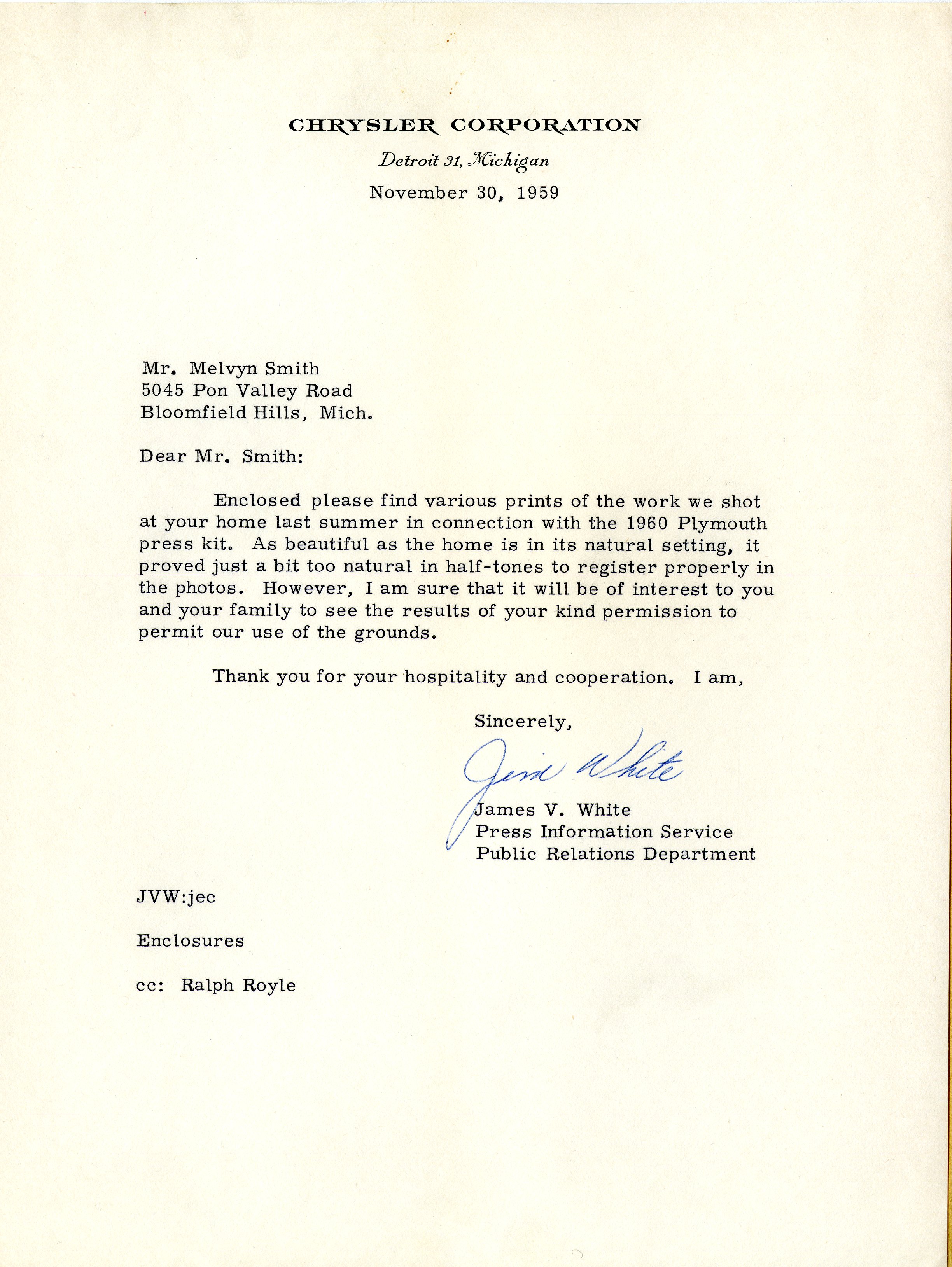 In 1959, Chrysler was developing promotional materials for the 1960 Plymouth. Seeking a sleek, modern backdrop for the long lines of the Suburban station wagon, Chrysler’s Public Relations Department contacted Melvyn and Sara Smith about staging a photoshoot at their Frank Lloyd Wright-designed home in Bloomfield Hills. The resulting photographs show the 18-ft long Suburban, not parked in the pea-gravel driveway or the distinctive cantilevered carport, but pulled to the back of the house where it could be reflected in the natural setting of the Smith’s newly expanded pond.
