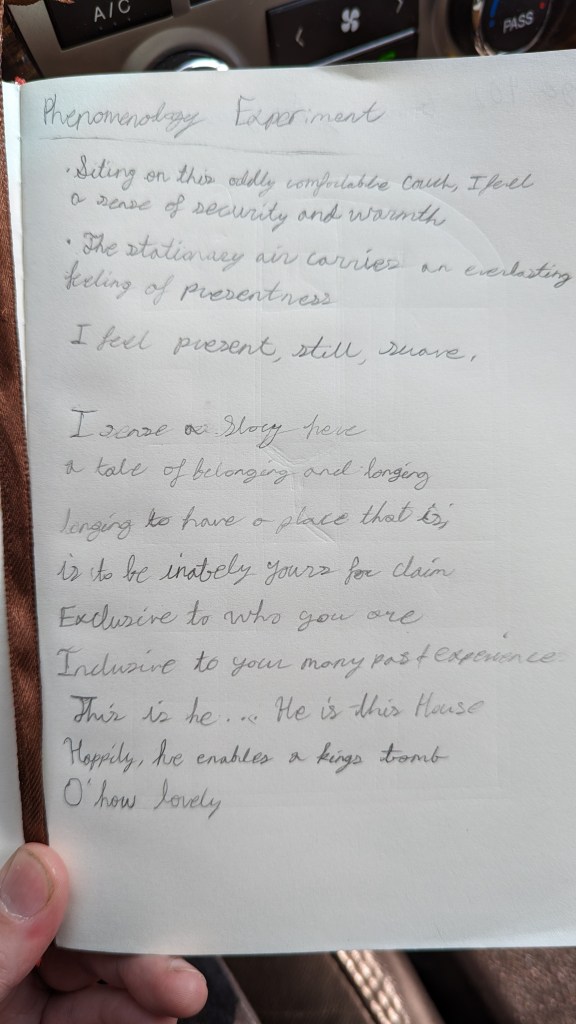 At Smith House, Nina led a phenomenology exercise, where, instead of telling the students the story of Frank Lloyd Wright and the Smiths, she simply asked each student to find a spot in the house to sit in quietly. Then, they wrote or sketched what they observed and sensed. Having such a tactile experience with the architecture and nature proved to be more memorable than a conventional tour.