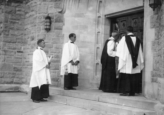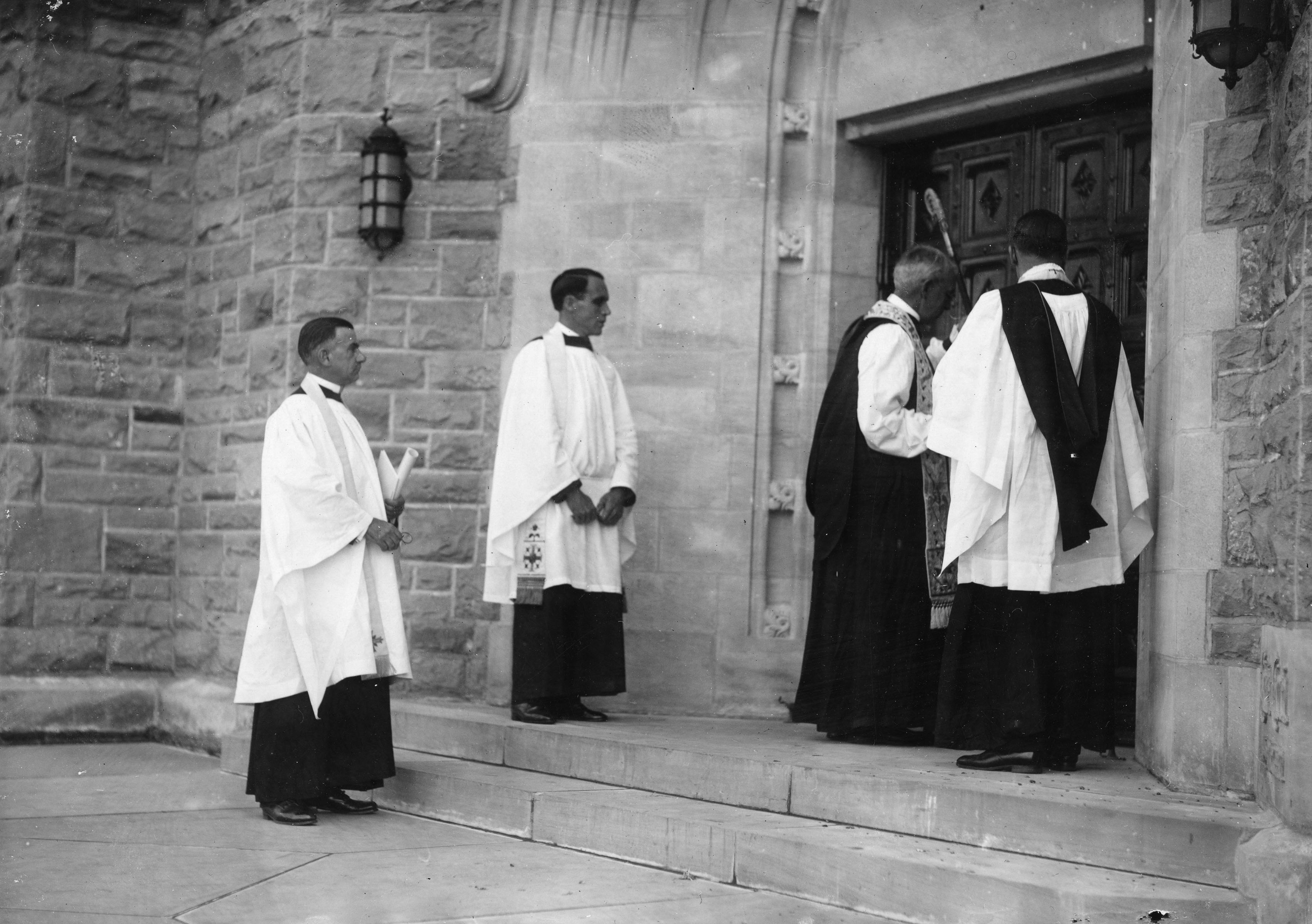 Consecration of Christ Church Cranbrook, September 29, 1928. Archdeacon Ramsey knocks on the door of the church, accompanied by Mr. Kinder, Bishop Page, Mr. Forsyth.