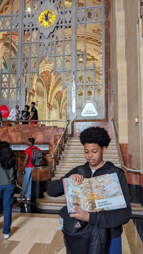 Then, we spent a class period each at Cranbrook House, Saarinen House, and the Frank Lloyd Wright-designed Smith House. In each location, students carried their sketchbooks and made notes and drawings about the architecture. I was especially impressed at the students’ analytical skills. In fact, while I usually love talking about the nitty-gritty specifics of Saarinen House, I found myself sitting much more quietly, asking students questions about what they noticed, liked, or disliked in each room. Listening to their observations and conversation helped me see each space anew.