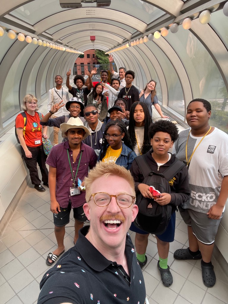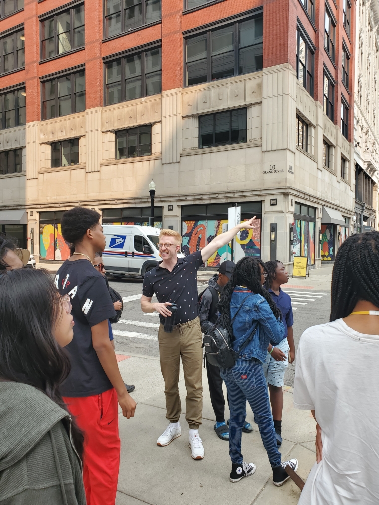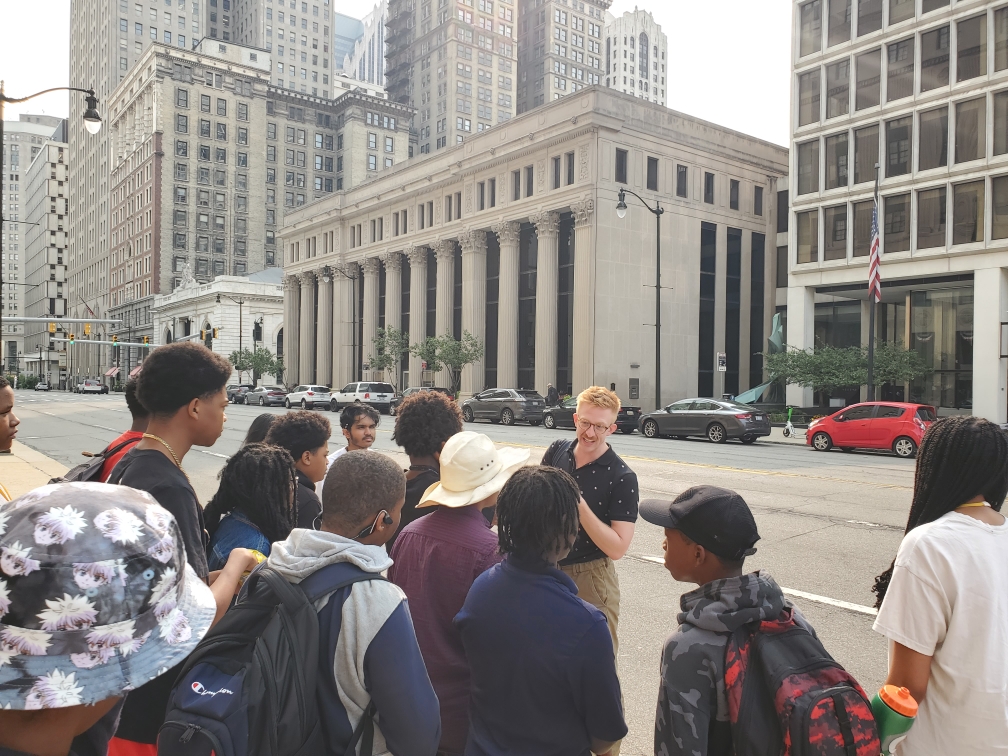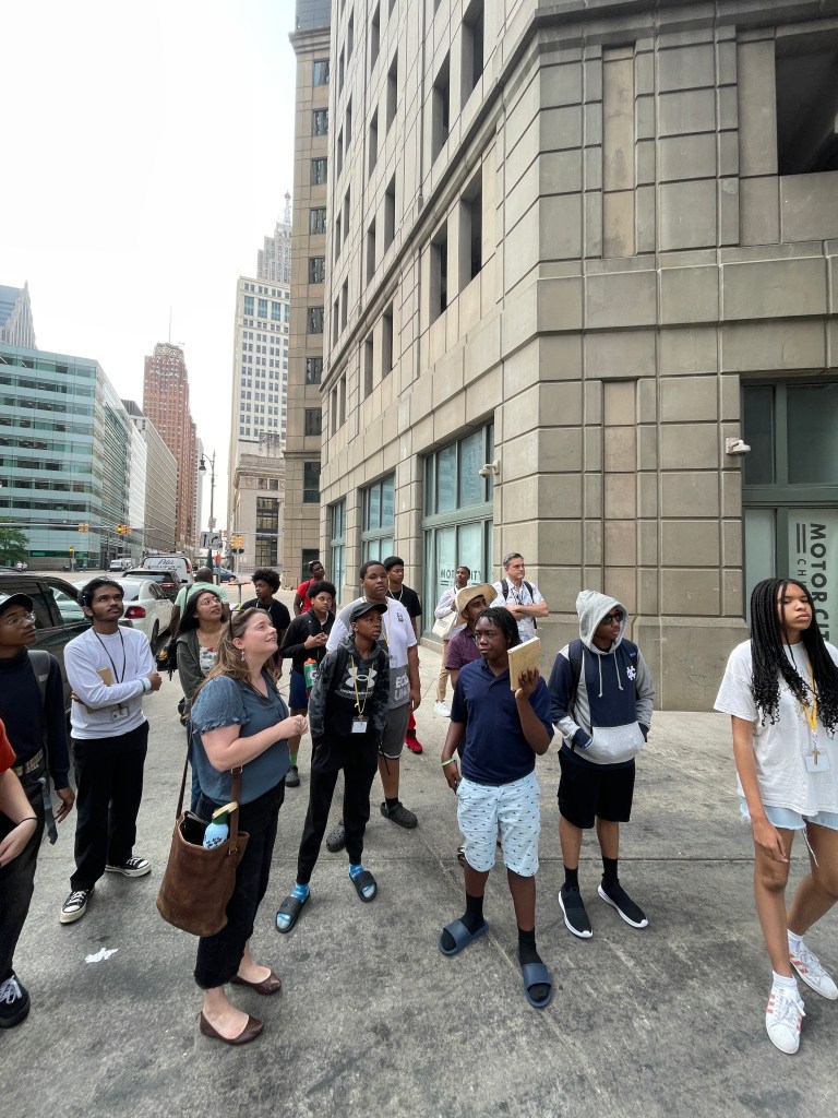 On our last day, Nina, Center Collections Interpreter Matt Horn, Center intern Clare Catallo, and I took the students for a full day (8am to 3pm!) field trip downtown. First, I led a walking tour of downtown Detroit—from the Foundation Hotel and Hart Plaza to the Federal Building, Penobscot Building, Capital Square, the Hudson Site, and so many Albert Kahn-designed mid-rise towers. Along the route, the students enthusiastically (and competitively) identified every Doric, Ionic, and Corinthian column. I was proud the lesson stuck.
