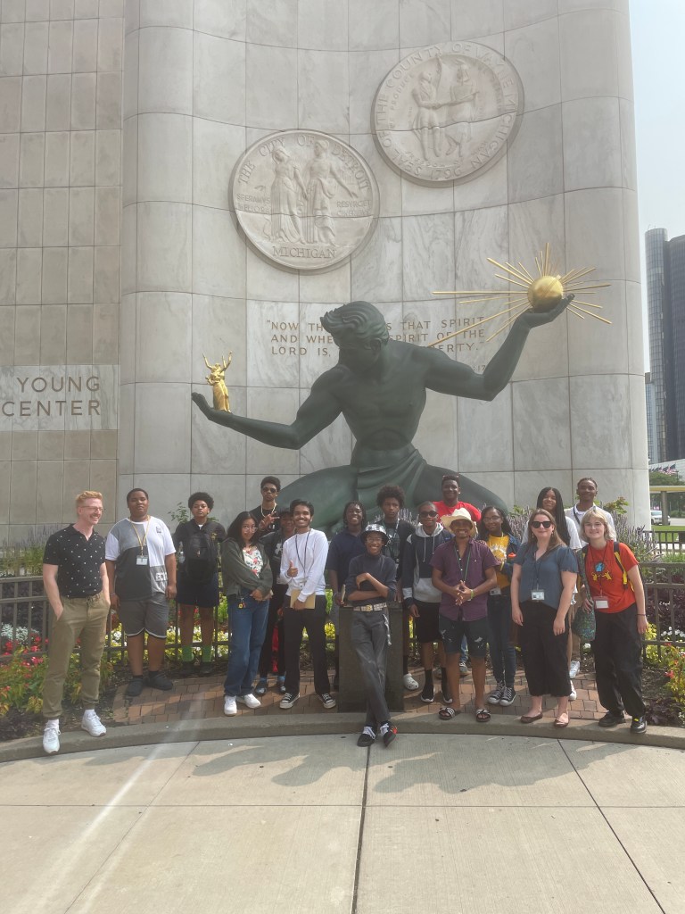 Arriving at Woodward Avenue and Grand Circus Park, we boarded the People Mover for a monorail-eye view of the city. This was a highlight for everyone—especially moving through a building at Cobo Hall!