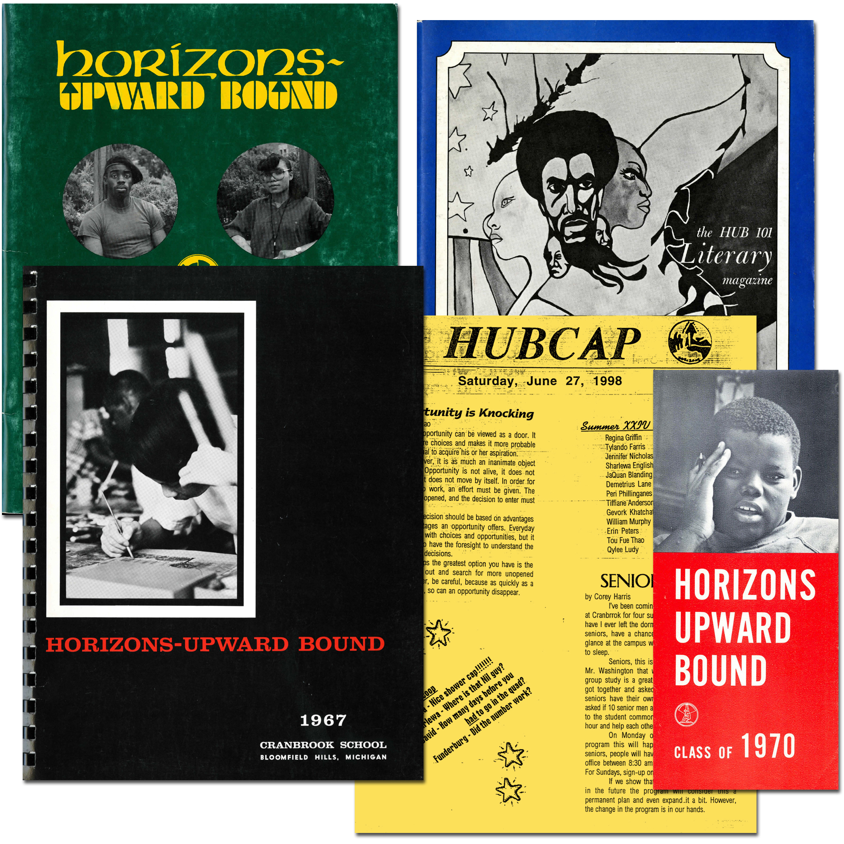 Selection of Horizons-Upward Bound publications spanning from the 1960s to 1990s, including annual reports, literary magazines, brochures, and newsletters. Courtesy of Cranbrook Archives.