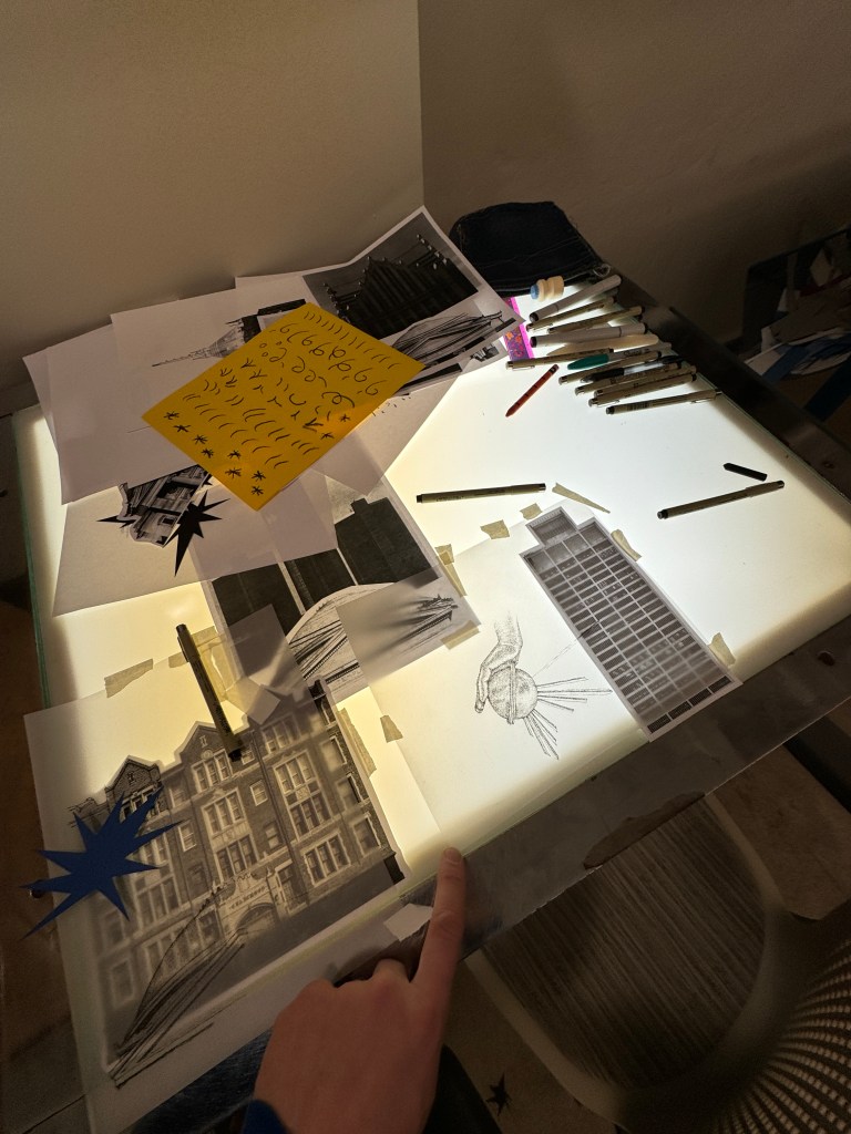 Luis went to work. They began by printing out and arranging the buildings I’d shared. Then, they began overdrawing some of the images—distorting or highlighting certain features.