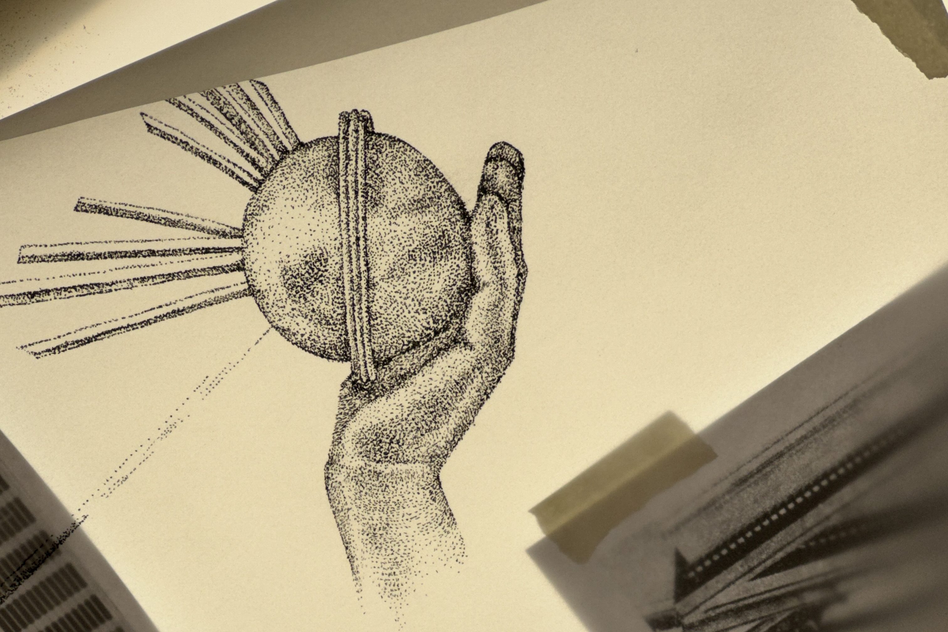 Layering on tracing paper, Luis dutifully stippled certain prominent architectural elements. I was especially impressed at the beautifully rendered hand, orb, and rays of Spirit of Detroit.