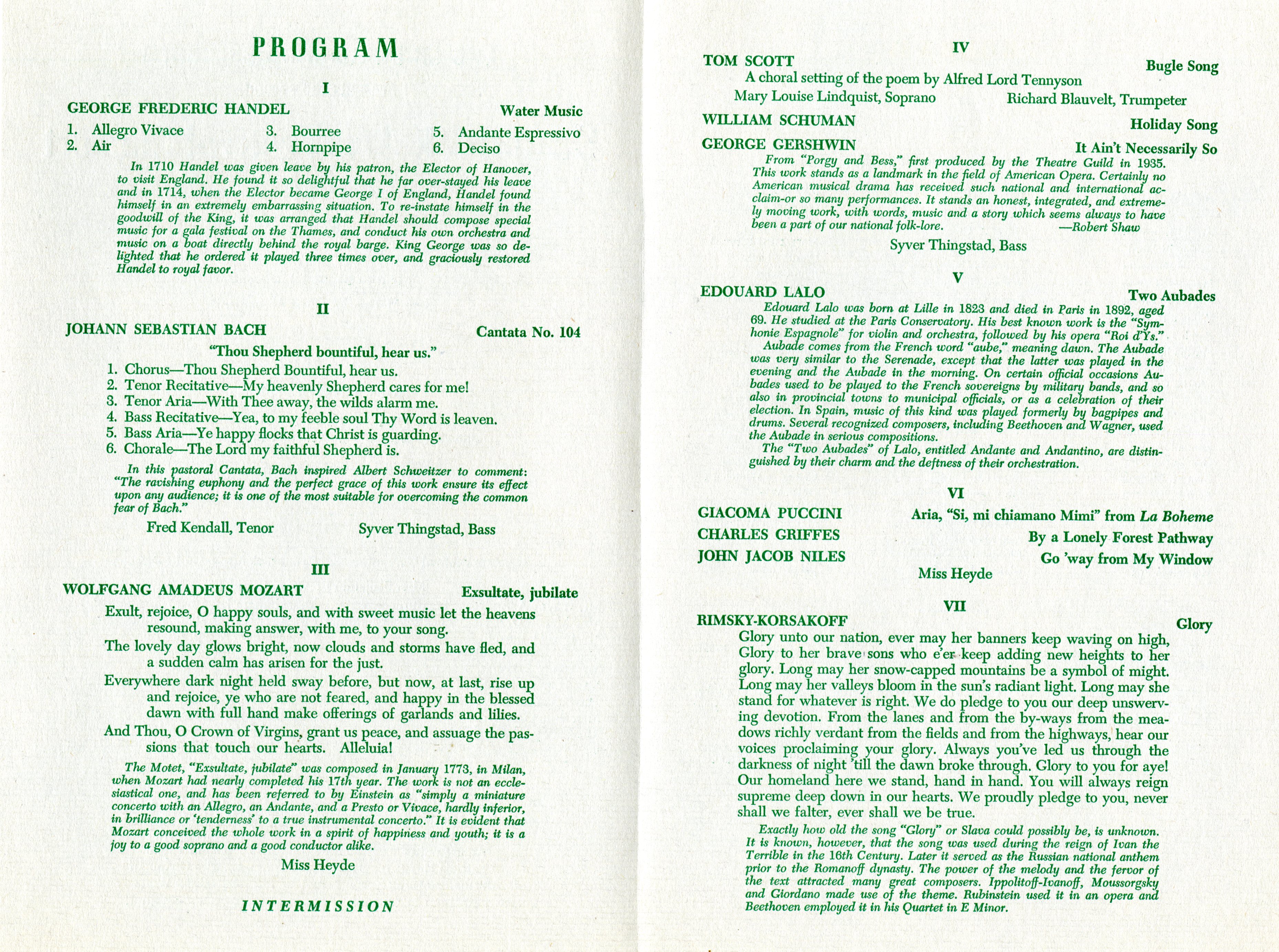 In the program for the Second Cranbrook Arts Festival Concert, which was performed at the Greek Theatre on June 1, 1952, I noticed a comment that is playfully instructive but also particularly salient to later developments in the Guild programming. The second concert program included Johann Sebastian Bach’s Cantata 104, “Thou Bountiful Shepherd, Hear Us,” and it was noted that it had inspired Albert Schweitzer to comment: