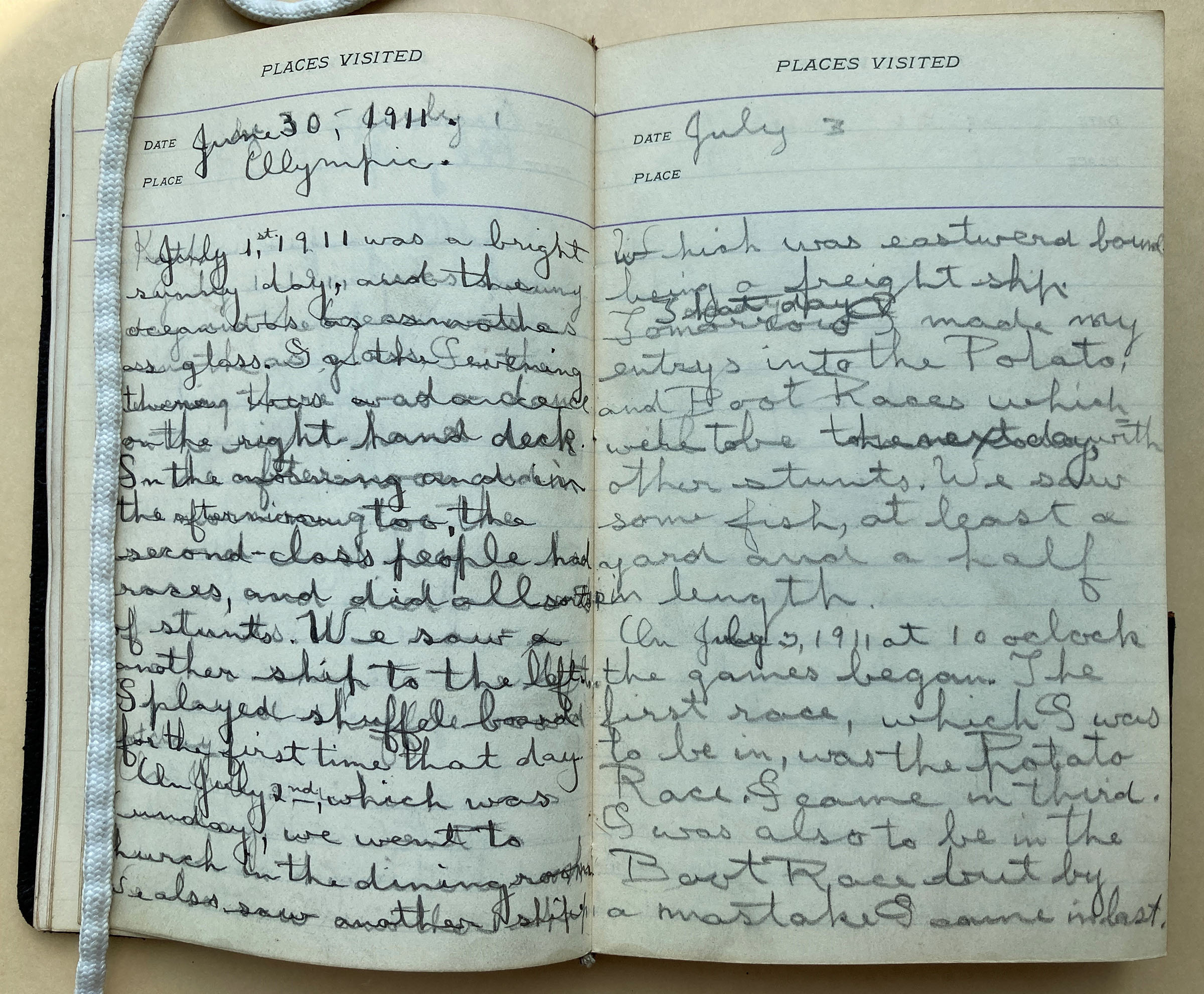 “On June 28, we went abord [sic] the great ship, “Olympic”. The Olympic is a fine ship. Florence was sick first night and day. It was somewhat rough on June 29th. I met a new friend but did not remember his name. In the morning, I could hardly stand, because of the new sensation. I was somewhat sick, but ate lots and I felt fine.” Henry Scripps Booth, June 28, 1911