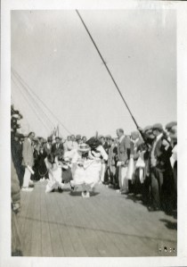 “July 1st, 1911, was a bright sunny day, and the ocean was as smooth as glass. In the evening, there was a dance on the right hand deck. In the morning and in the afternoon too, the second-class people had races, and did all sorts of stunts. We saw another ship to the left. I played shuffleboard for the first time that day. On July 2nd, which was Sunday, we went to church in the dining room. We also saw another ship [July 3] which was eastwerd [sic] bound being a freight ship.” Henry Scripps Booth, July 1, 1911