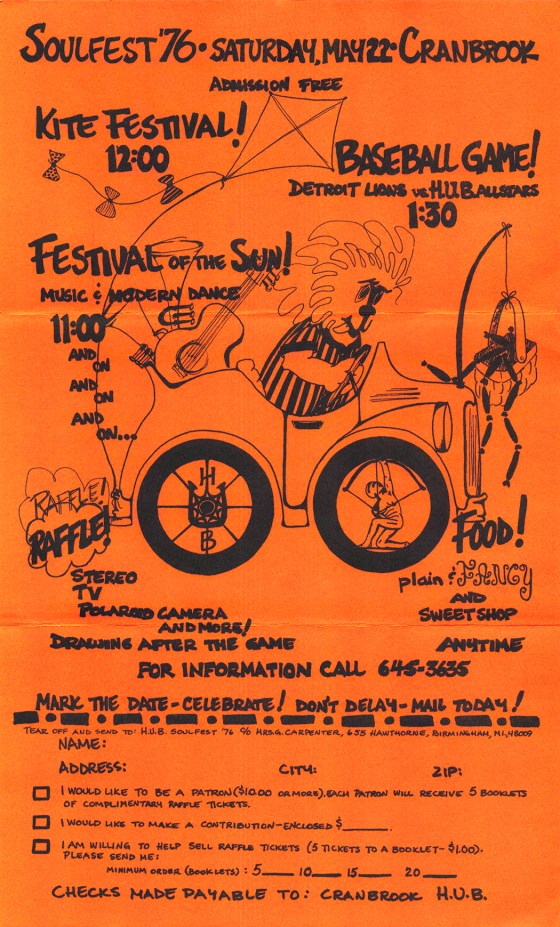 Soulfest was an biannual and major community fundraising event for the HUB program in the 1970s. It was inspired by HUB parent, Lula Barnes, who also provided the recipes, and created and organized by Margot Snyder. Margot, “whose sustaining and nurturing hands…helped shape Horizons-Upward Bound since its beginnings, ” was an integral and beloved member of the Cranbrook Schools and HUB community and wife of HUB founder Ben M. Snyder (HUB class brochure, 1994).