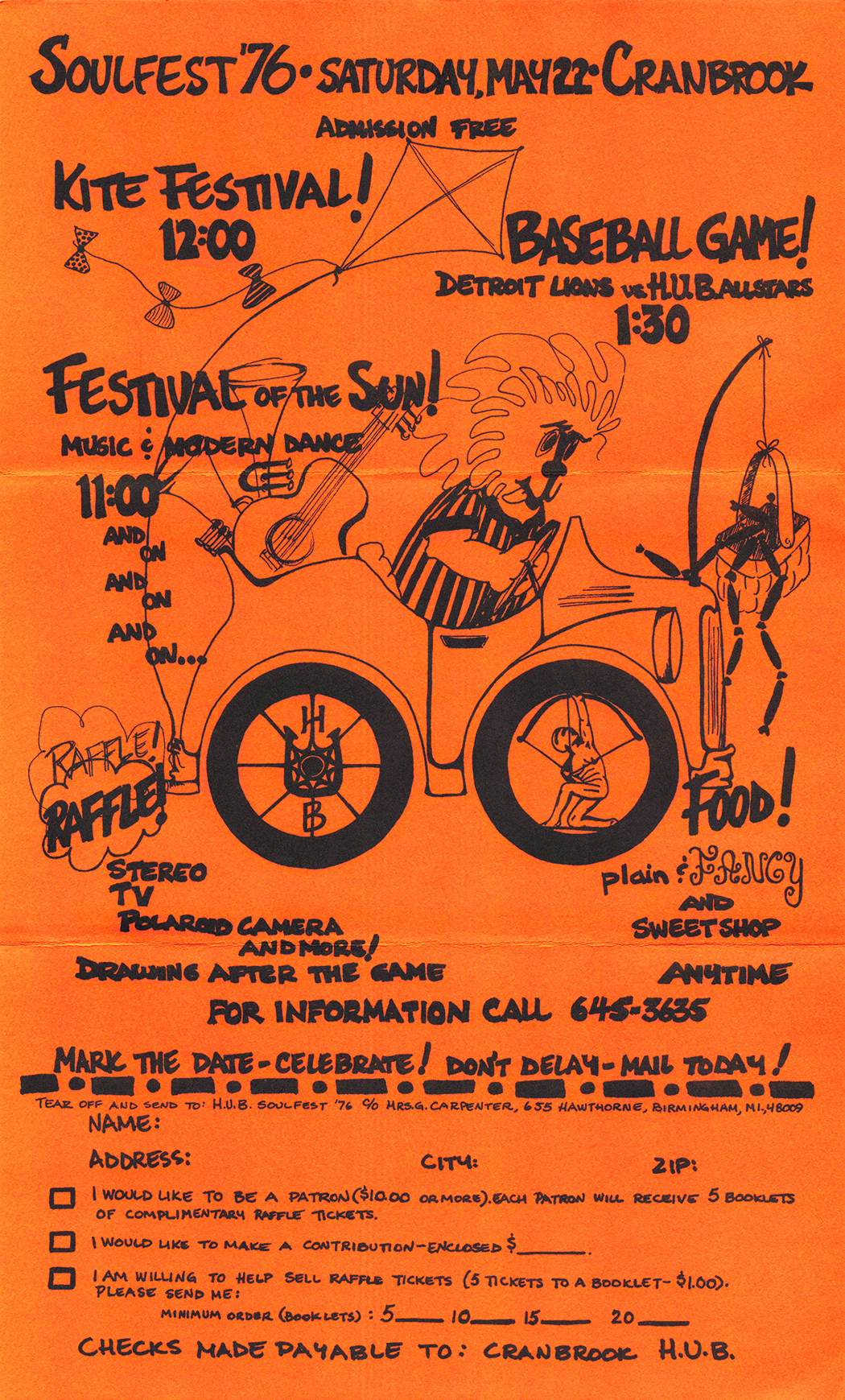 Soulfest was an biannual and major community fundraising event for the HUB program in the 1970s. It was inspired by HUB parent, Lula Barnes, who also provided the recipes, and created and organized by Margot Snyder. Margot, “whose sustaining and nurturing hands…helped shape Horizons-Upward Bound since its beginnings, ” was an integral and beloved member of the Cranbrook Schools and HUB community and wife of HUB founder Ben M. Snyder (HUB class brochure, 1994).