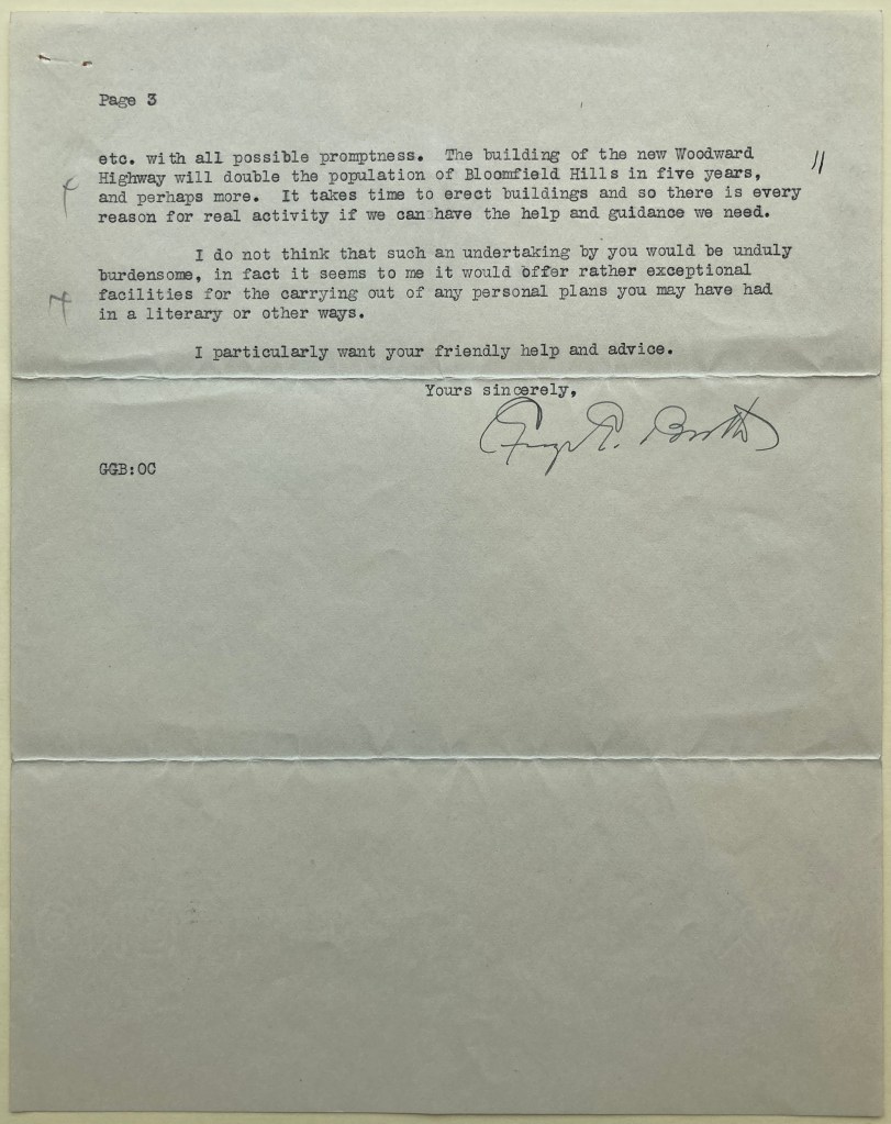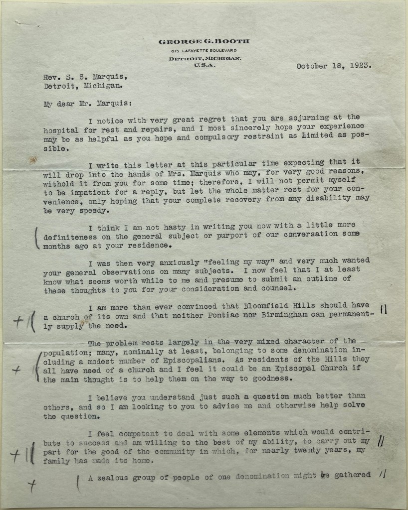 The October 1923 letter from Booth to Marquis reiterates the problem of the “mixed character of the population” which had engaged Booth’s discernment prior to establishing an Episcopal Church. It is one of many letters which document his trust in Marquis’ wisdom as a clergyman teaching the way of Christian life. At that time, the Booth family and others in the district traveled to Pontiac or Birmingham to attend church, having none in Bloomfield. There was a growing need for a church here.