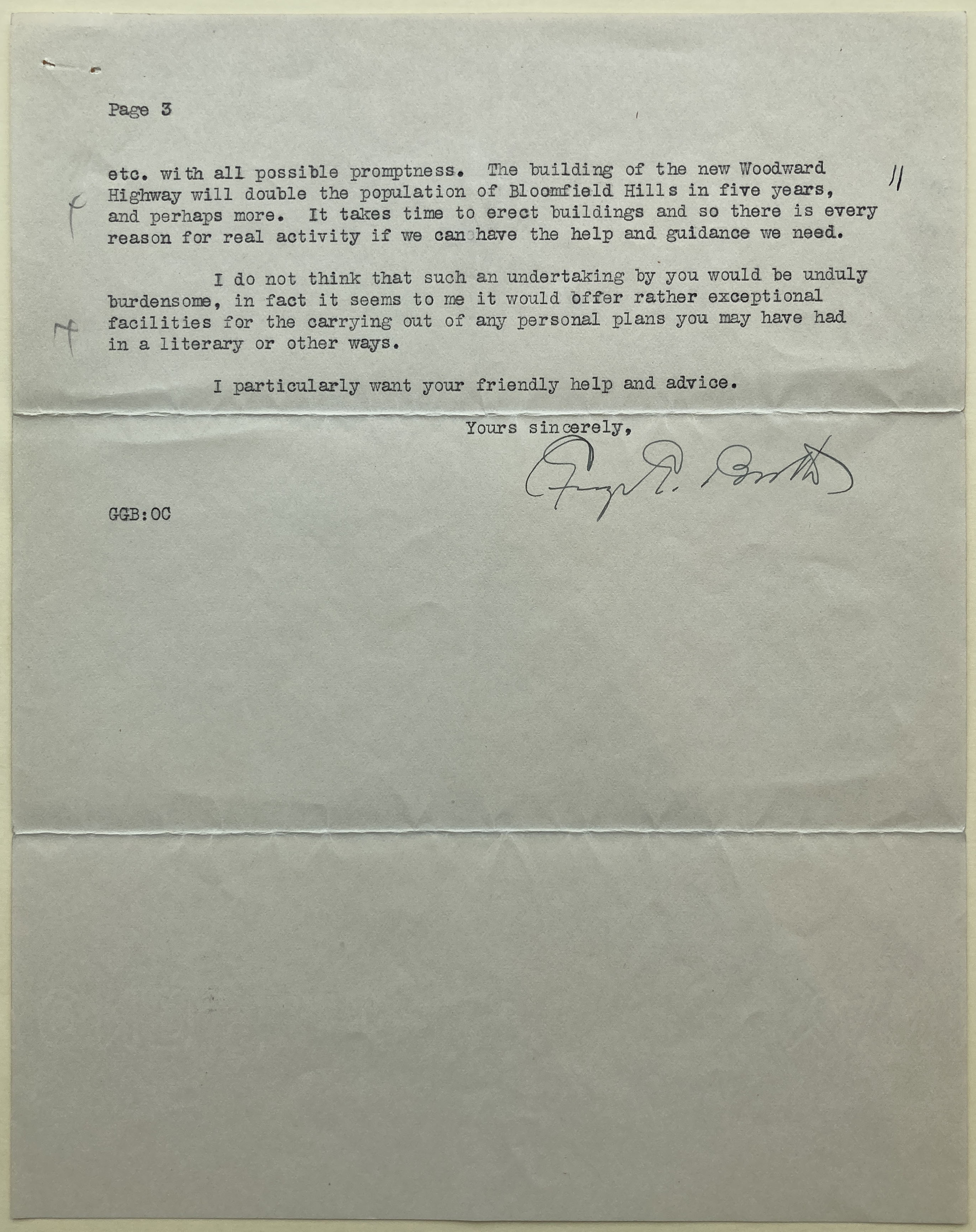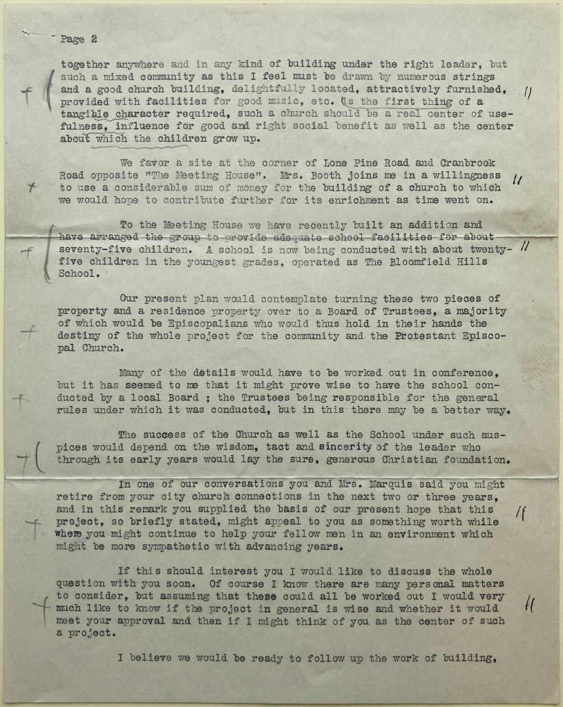 A year after the ‘Bloomfield Hills School’ opened in 1922, Mr. Booth wrote to Rev. Dr. Marquis to seek his consideration and counsel in the matter of building a larger church and school complex. They had discussed the matter some months before at Dr. Marquis’ home, but now Mr. Booth was decided in it, and he asked Dr. Marquis if he might think of him, “as the center of such a project.”