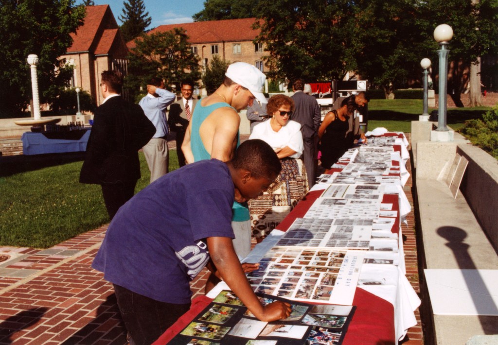 Members from the HUB community review photographs of the program on the Quad during HUB’s 30th anniversary celebration, August 1994. Courtesy of Cranbrook Archives.
