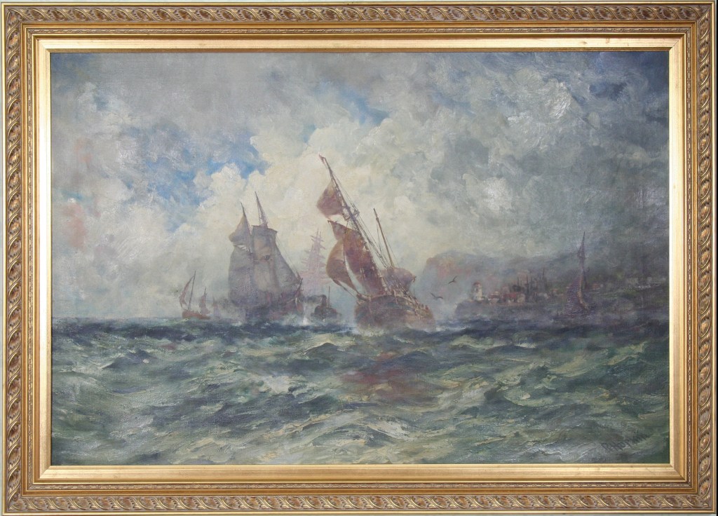 The painting’s official title is not noted. The Thornlea painting is interchangeably referred to as Homeward Bound, Schooner on a Stormy Sea, Sailing Ship at Sea, and Marine. However, the 1901 Hopkin exhibition catalog does not list any paintings with those titles.