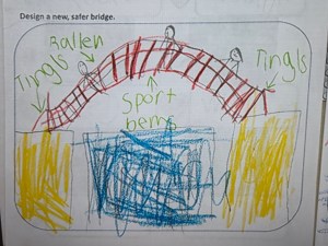DS: After analyzing all this, the students got to work designing a safer bridge for “SK Island”. They learned that triangles are super strong shapes and that engineers use them all the time when building bridges. With their users in mind, the students carefully designed and built models of brand-new, safer bridges. Their final step is to share their ideas with the garden’s groundskeepers.