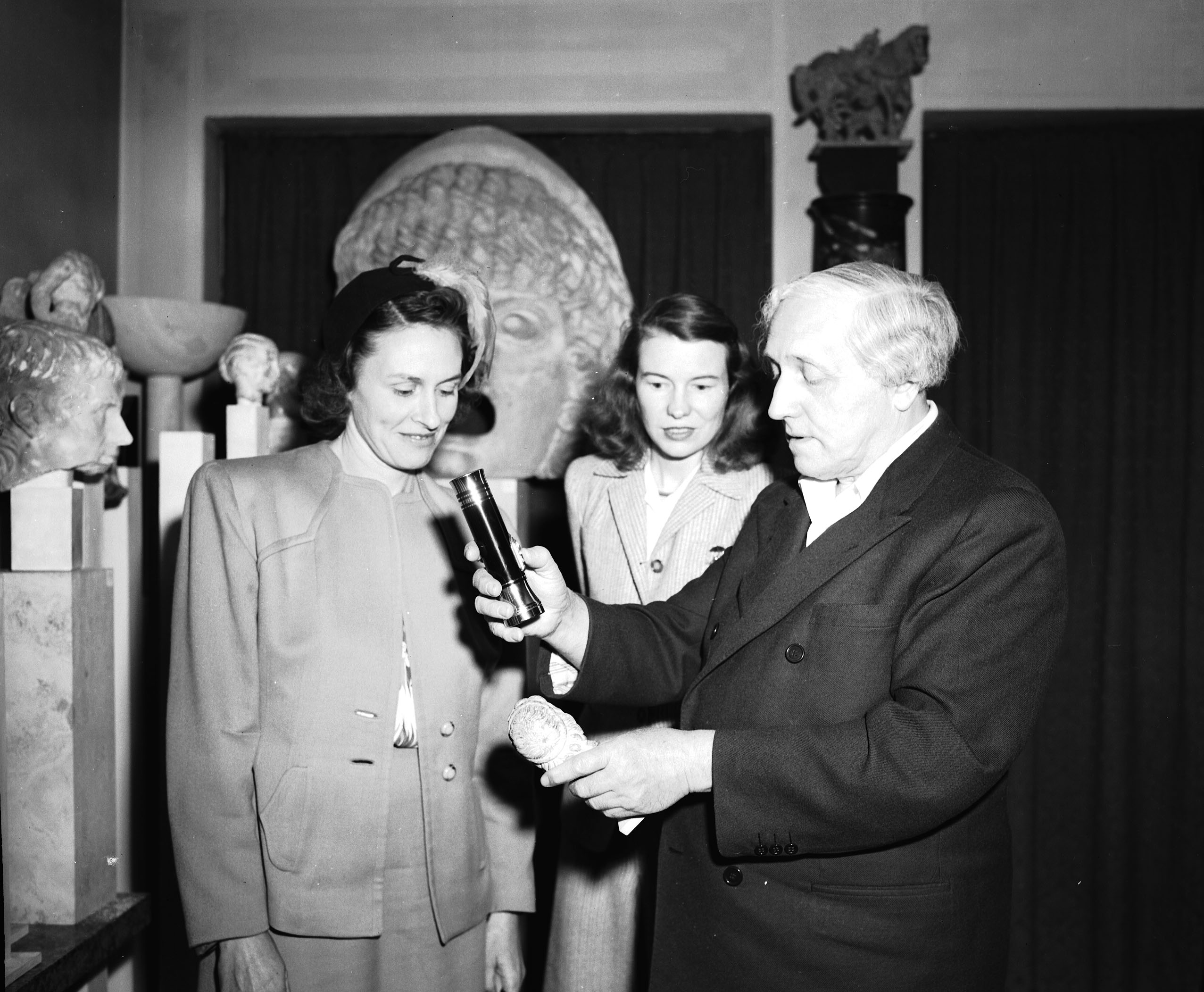 Carl Milles discusses details of a sculpture during an open house, 10 May 1947. Courtesy of Cranbrook Archives.
