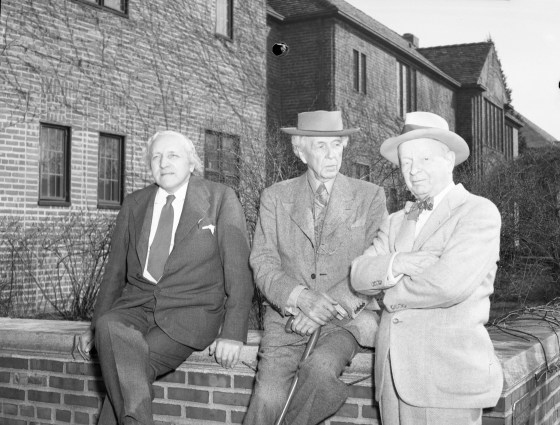 Carl Milles, Frank Lloyd Wright, and Eliel Saarinen (l to r) outside Saarinen House, March 1945. Harvey Croze, photographer. Courtesy of Cranbrook Archives.