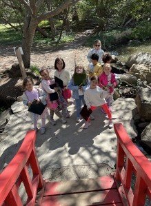 The Senior Kindergarteners exploring the Cranbrook Japanese Bridge (aka Red Wood Bridge) in the Japanese Garden, 2025.