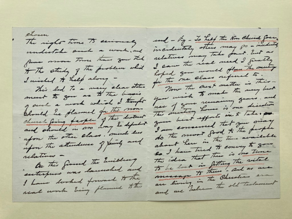 In the letter from George to his father, we also learn that he is prudent in observing the religious character of Bloomfield residents. During the years in which the Meeting House was used for religious services (1918-1926), Mr. Booth would reflect on the visiting clergy and service attendees (both of which came from diverse denominations), from which he would eventually discern the denomination of “Cranbrook church.”